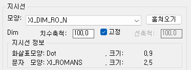 - 치수축척 : 입력하고 하는 치수축척입니다. 기본값은 현재 도면의 치수축척 (DimScale)을 읽어 오는 것인데, 일정 값을 유지하고 싶다면 [저장]을 켭니다.