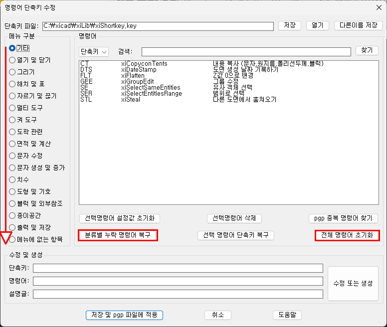 상단의 "유틸리티" 메뉴 안에 "열기, 닫기 및 설정"에 있는 "명령단축키 변경, COM" 을 실행하신 후, "저장 및 pgp 파일에 기록"을 클릭하면 XiCAD 명령어 단축키를 지금 사용하고 계시는 pgp 파일에 기록합니다. (기존 pgp 파일의 사용자 단축키는 그대로 유지되면서 XiCAD 명령어만 추가됩니다.)