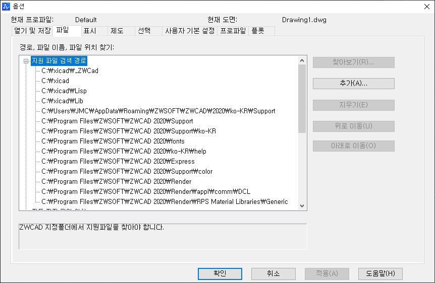 나. [도구- 옵션 - 파일]에 xicad 경로가 있는지 확인