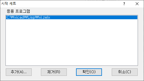 XiCAD는 아래 그림에서 [응용프로그램 로드 - 시작세트]에 xi.zelx 파일을 넣는 것으로 작동됩니다.