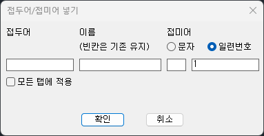 탭이름에 접두어/접미어를 넣습니다. 실행하면 새로운 대화상자가 나옵니다.