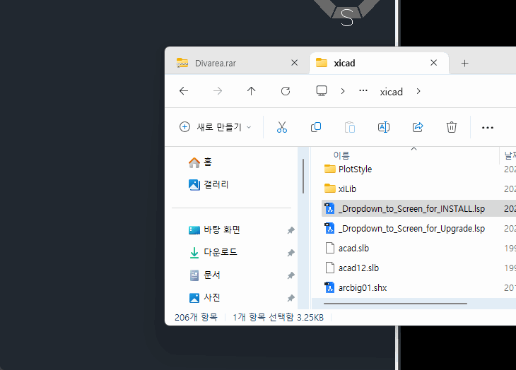 캐드 화면에, ../xicad/ _Dropdown_to_Screen_for_INSTALL.lsp 파일을 드레그앤드롭 하면 실행됩니다.