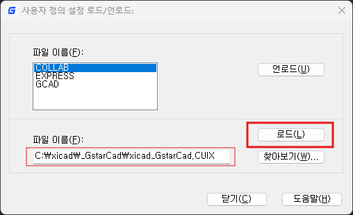명령어창에서 "menuload" 를 실행 후, ../xicad/_GstarCad/xicad_GstarCAD.cuix 를 선택 후, "로드"