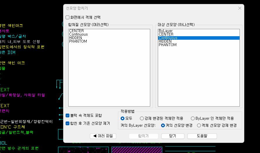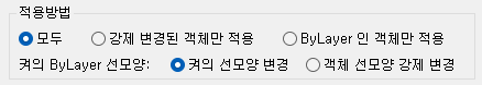 - ByLayer 인 객체만 적용 : 강제변경된 객체는 제외를 합니다.
