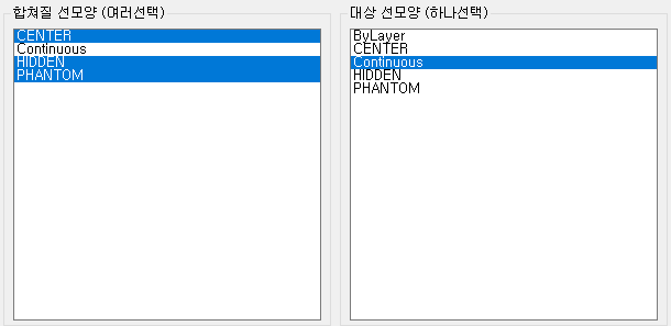 켜 합치기와 마찬가지로, 왼쪽에서 합쳐질 선모양 여러개를 선택하면, 오른쪽에서 선택된 선모양으로 합쳐입니다.