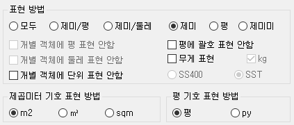 각종 설정은 객체를 선택 후, 명령어 창에서 S 를 누르면 아래와 같은 설정화면으로 접근 됩니다.설정에 따라 각 개별 객체 중간에 면적을 기입할 수도 있습니다.