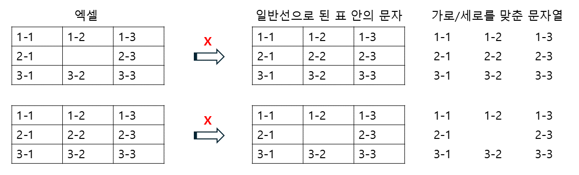 아래와 같이 중간에 비어 있을 경우는 변환되지 않거나, 칸이 밀려서 입력이 됩니다.