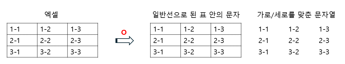 다만, 문자열이 중간에 비어져 있는 것은 적용되지 않습니다. 즉 가로, 세로열의 문자 갯수가 동일해야 가능합니다.