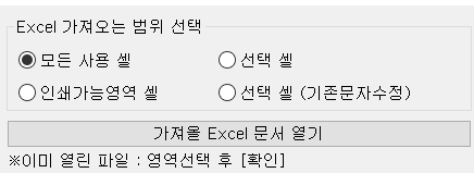 인쇄가능영역 셀 가져오기 : 열린 엑셀파일에서 인쇄영역을 지정했을 경우, 그 영역의 내용을 가져 옵니다.