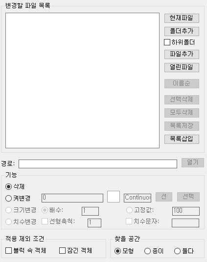 선택된 조건의 객체를 목록에 등록된 파일 들에서 찾아서 삭제, 켜변경, 크기변경, 치수변경을 할 수 있습니다.