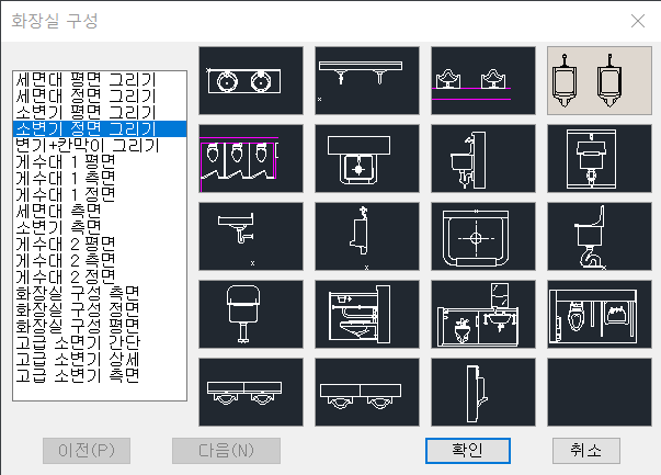 [심볼 메뉴 - 화장실 구성] 에서 [소변기 정면 그리기]를 선택하면 실행됩니다.