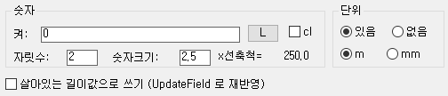 선분의 길이를 합산 하되, 켜별로 나누어 합산을 해서 결과 값을 산출하는 옵션입니다. 단, 기존 문자 교체로 결과값을 넣을 경우는 기능이 억제됩니다.