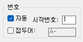 - 접두어 : 도면번호 앞에 붙는 문자입니다. 이 옵션을 켜면 도면번호를 자동으로 하든 그렇지 않든 항상 추가됩니다.
