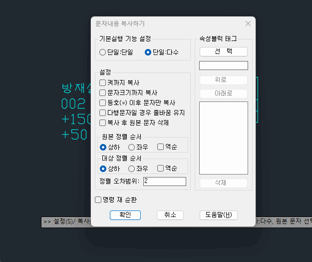 여러 문자를 속성블럭에 태그로 인식하여 문자 내용을 복사해 넣습니다.