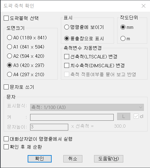 확인된 축척으로 도면의 선축척과 치수축척을 동시에 변경하는 옵션입니다.