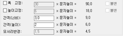 불변 : 위의 계산을 모두 무시하고, 문자의 크기와 전혀 상관없이, 폭과 높이를 절대값으로 고정하고 싶을 때 선택을 합니다.