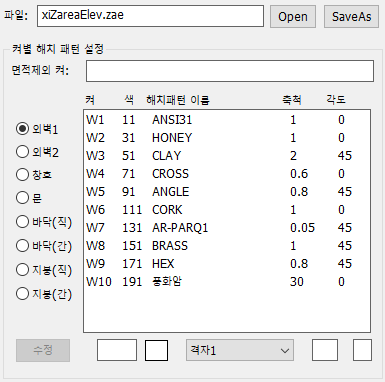 그 하부에는 각 인식되는 켜의 이름과 해치패턴, 그리고 켜의 색상 등을 지정할 수 있습니다.