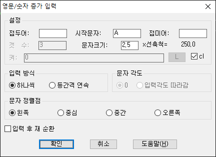 입력방식을 [등간격 연속]으로 지정하면 지정간격과 각도로 문자가 하나씩 증가하면서 입력됩니다.