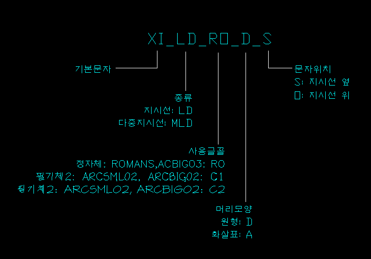 XiCAD에서 사용하는 지시선 이름의 설명입니다.