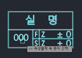 속성블럭(A) 옵션을 선택할 경우, 블럭 자체를 선택하면 안되고, 아래 그림 처럼 블럭 안의 문자를 선택해야 합니다.
