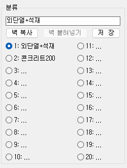 입력의 경우 20 종류의 벽체를 미리 입력해 두고 사용할 수 있습니다.