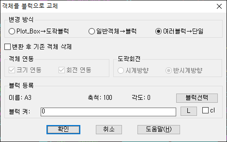 예를 들어.. 같은 도곽 블럭이 여러 다른 이름으로 삽입되어 있을 때, 이 것을 하나로 통일시킬 수 있습니다.