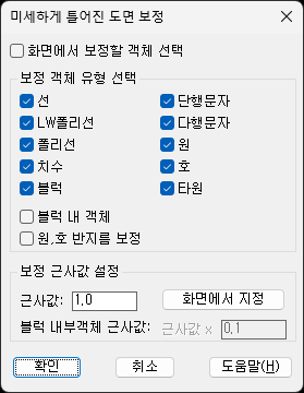명령어를 실행하여, 설정(S)를 누르면 설정 화면이 나타나면, 여기서 보정하고 싶은 객체의 종류를 선택하고, 보정근사값을 설정하면 됩니다.