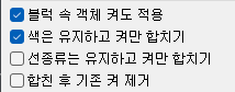 강제로 색이 변경된 객체일 경우, 그 색을 유지하고 켜만 합칩니다. 선택을 하지 않으면 ByLayer 로 변경됩니다.
