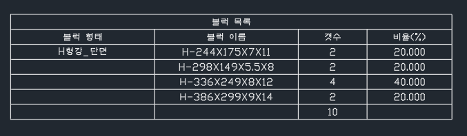 도면 내의 선택 또는 모든 블럭과 그 갯수를 표로 만드는 명령어입니다.